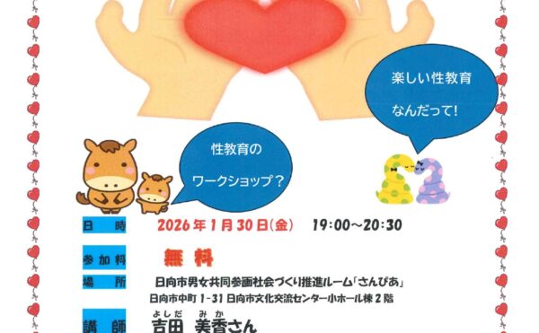 2026年1月5日セミナー案内サンピアスタッフ専用 性教育講座②のご案内令和8年1月30日(金)19:00~さんぴあにて「性教育講座②」を開催します。講師に宮崎県助産師会の吉田 美香さんをお迎えして 参加型の性教育講座となっています。ぜひ、ご参加ください。