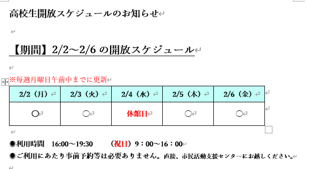 高校生開放スケジュールのお知らせ